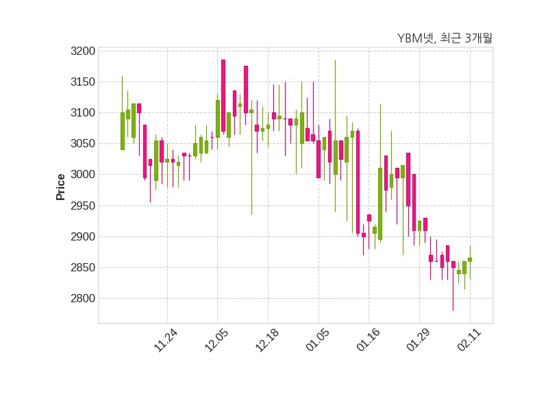 한편, YBM넷은 장 마감 이후 해당 기업공시를 발표했으며 오늘 종가가 2,865원, 거래량은 37,516주로, 직전 거래일 대비 5원(+0.17%) 상승했다.