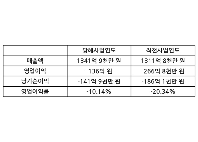 이번사업연도의 매출액은 직전사업연도 대비 2.3% 증가한 1341억 9천만 원, 영업이익은 -136억 원, 당기순이익은 -141억 9천만 원이라고 공시했다.