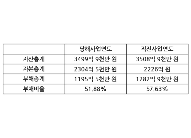 또한, 이번사업연도의 자산총계는 3499억 9천만 원으로 직전사업연도 대비 -0.26% 감소한 한편, 부채총계는 1195억 5천만 원으로 -6.82% 감소, 자본총계는 2304억 5천만 원으로 3.52% 증가했다.
